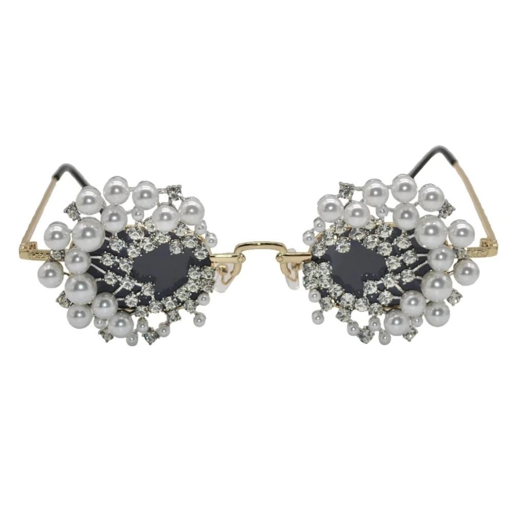 Óculos Strass Pérola, é uma peça exclusiva, personalizada e feita a mão. Sua armação é retangular, porém o aplique com Strass e Pérolas é uma peça redonda, portanto veste muito bem em pessoas com formato de rosto mais retangulares, quadrados e diamante. Um óculos super diferente que vai deixar seu look ainda mais interessante. Pra quem gosta de um glamour, esse é seu óculos.