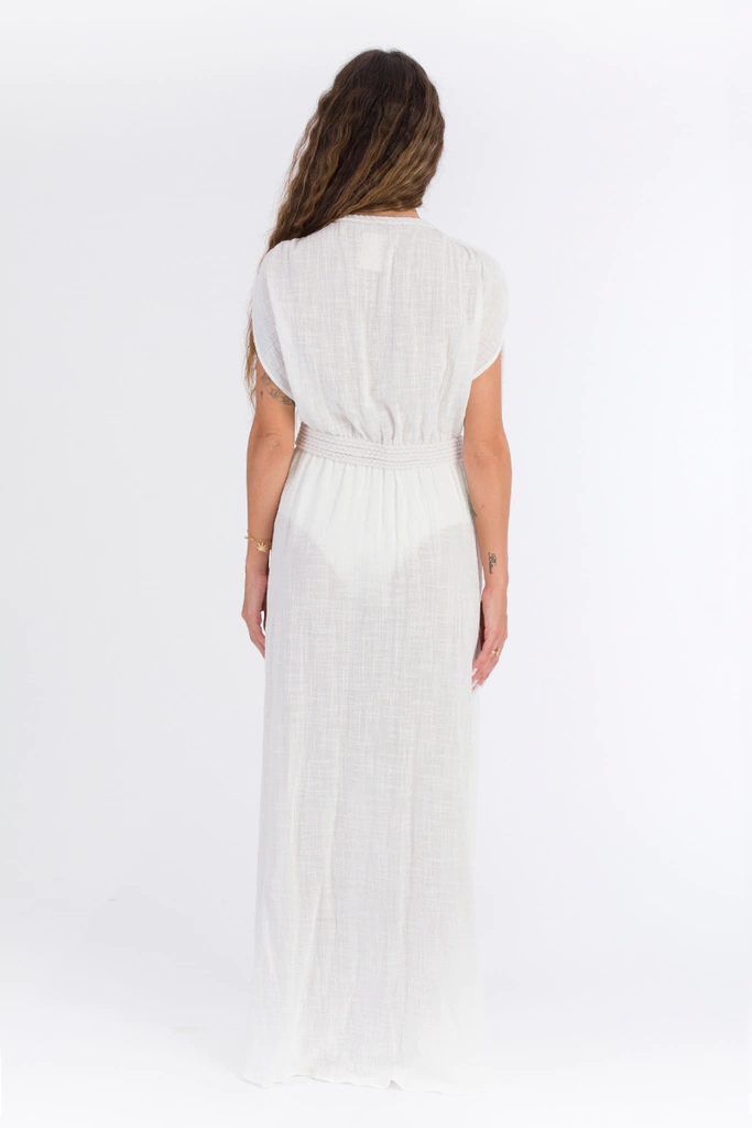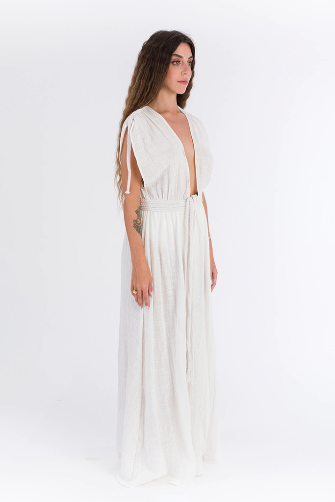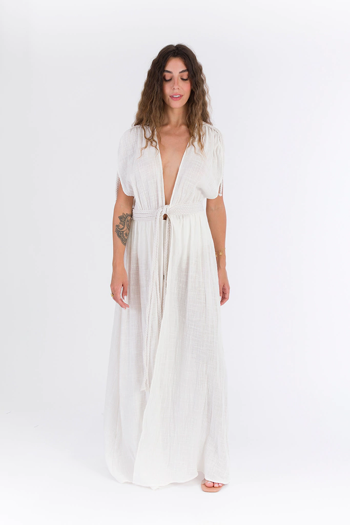 Feita em algodão, material versátil, que traz um ar descontraído e leve para quando usada como saída de praia; Com os acessórios certos, e transpassando as cordas e dando um nó nas costas, se transforma em um vestido muito elegante para um final de tarde de verão, seja em um resort, praia, ou até mesmo para ir a um restaurante.