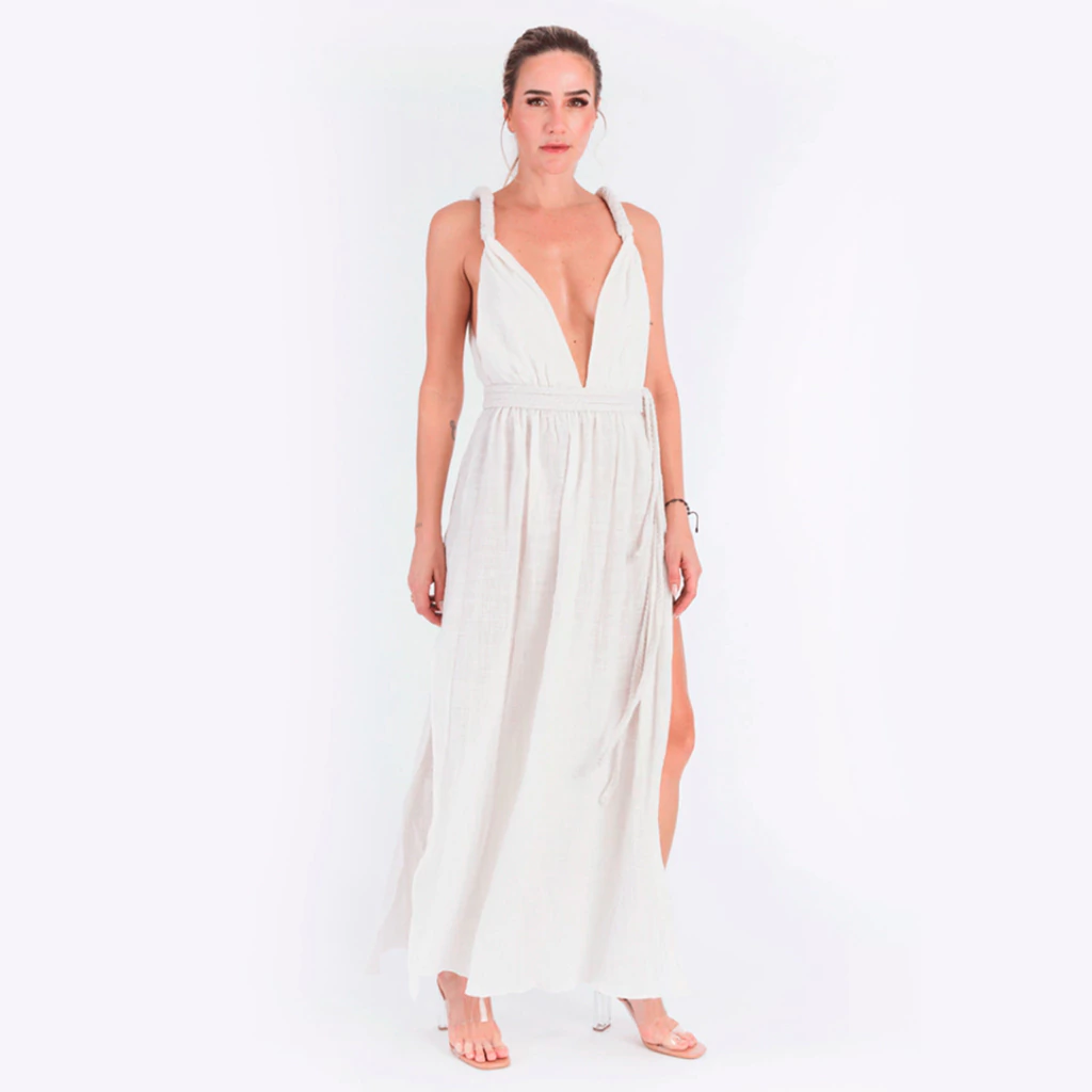 As cordas na cintura e em todo o busto junto com o acabamento plissado do tecido dão vida a um efeito texturizado onde conforto e luxo se cruzam. Este é o vestido ideal para um evento na praia, como aniversários, casamentos, festas.