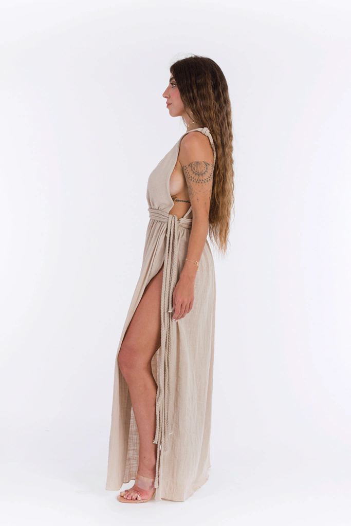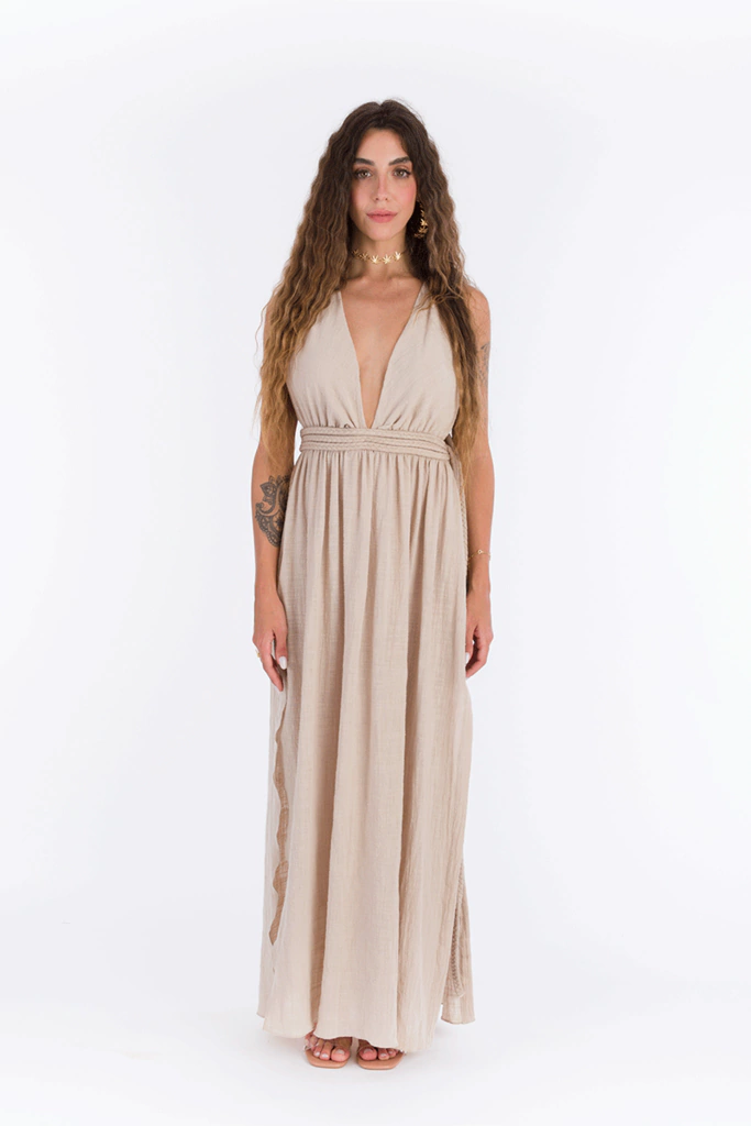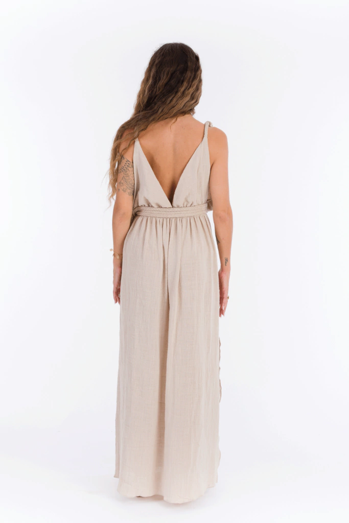 Nosso Vestido Lis tem decote V profundo no busto e nas costas trazendo a peça um toque de sensualidade. Assim como seu fechamento lateral com detalhes de cordas.